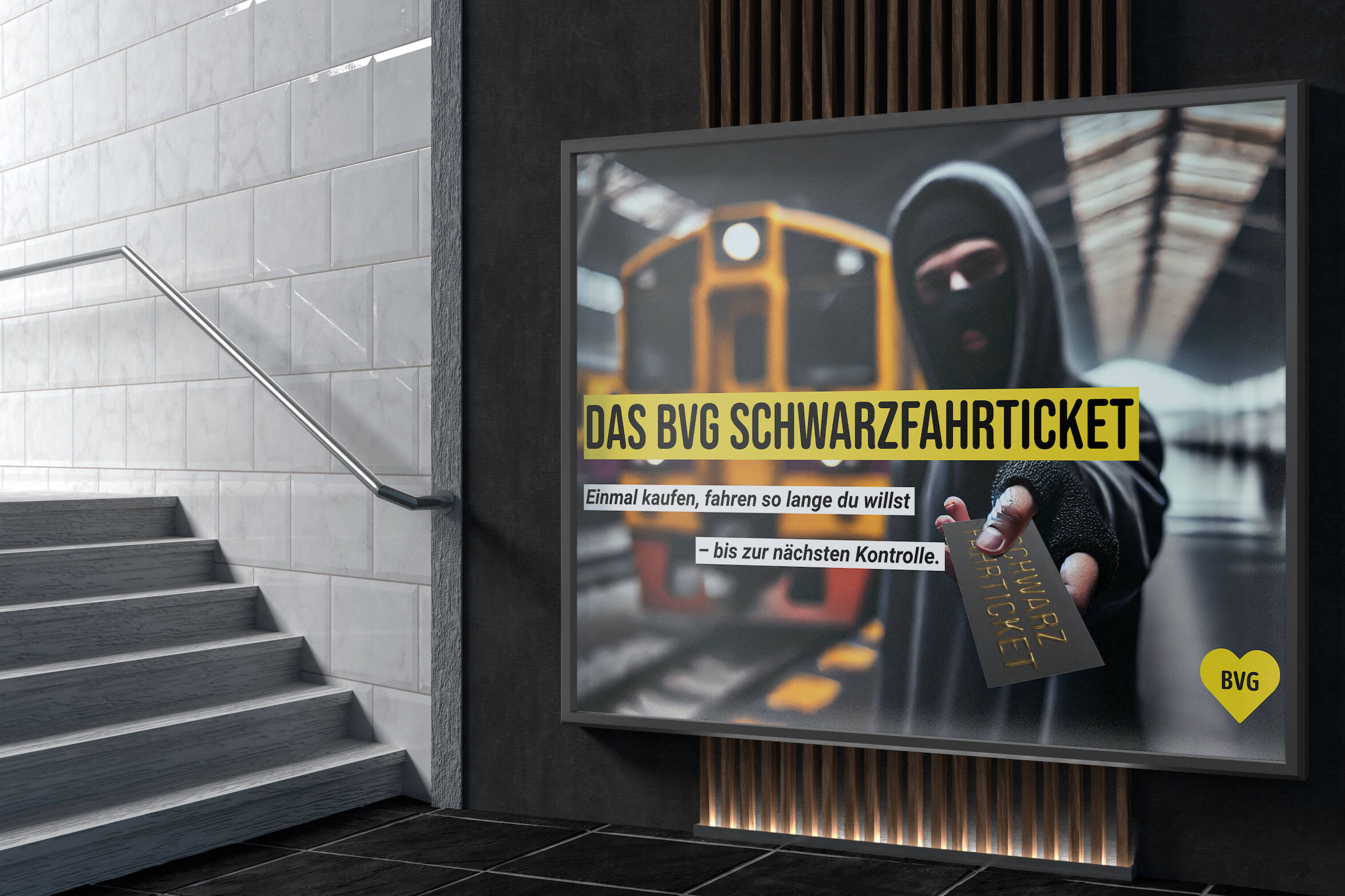 Meine Idee für die BVG-Aufgabe war das sogenannte „Schwarzfahrticket“ – ein Ticket, das man für 10 € am Automaten kaufen kann und mit dem man zeitlich unbegrenzt fahren darf, bis man kontrolliert wird. Danach verliert es seine Gültigkeit und man benötigt ein neues. Die Aktion wird durch eine Plakatkampagne, Social-Media-Beiträge und Merchandise beworben und soll mit einem Augenzwinkern zeigen, dass Bahnfahren Spaß machen kann – besonders für eine jüngere, humorvolle Zielgruppe.
