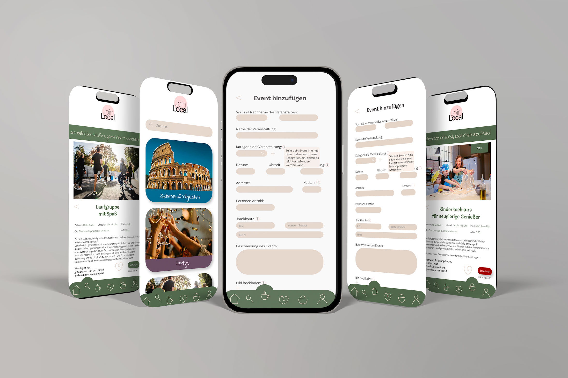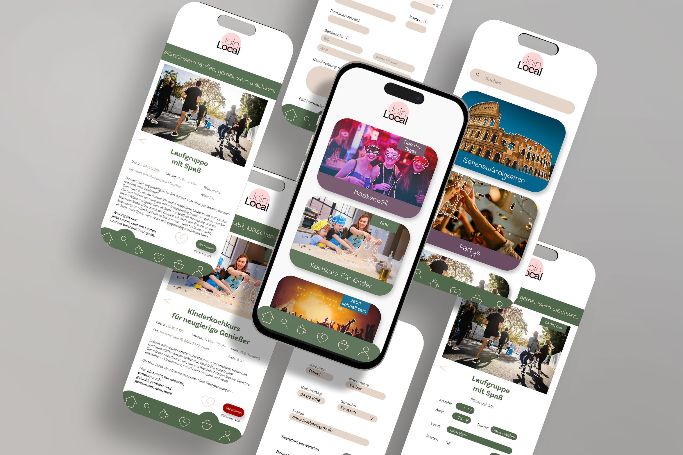Im Rahmen eines Uni-Projekts habe ich eine App entwickelt und designt, mit der man Events und Veranstaltungen in der Umgebung entdecken kann. Dabei geht es nicht nur um Partys, sondern auch um Kochkurse, Sportgruppen oder lokale Aktivitäten. Über die App kann man sich direkt anmelden und erhält eine Benachrichtigung, sobald das Event stattfindet. Zudem können Nutzer eigene Veranstaltungen planen, und dank der übersichtlichen Gruppeneinteilung findet man schnell genau das, was einen interessiert.